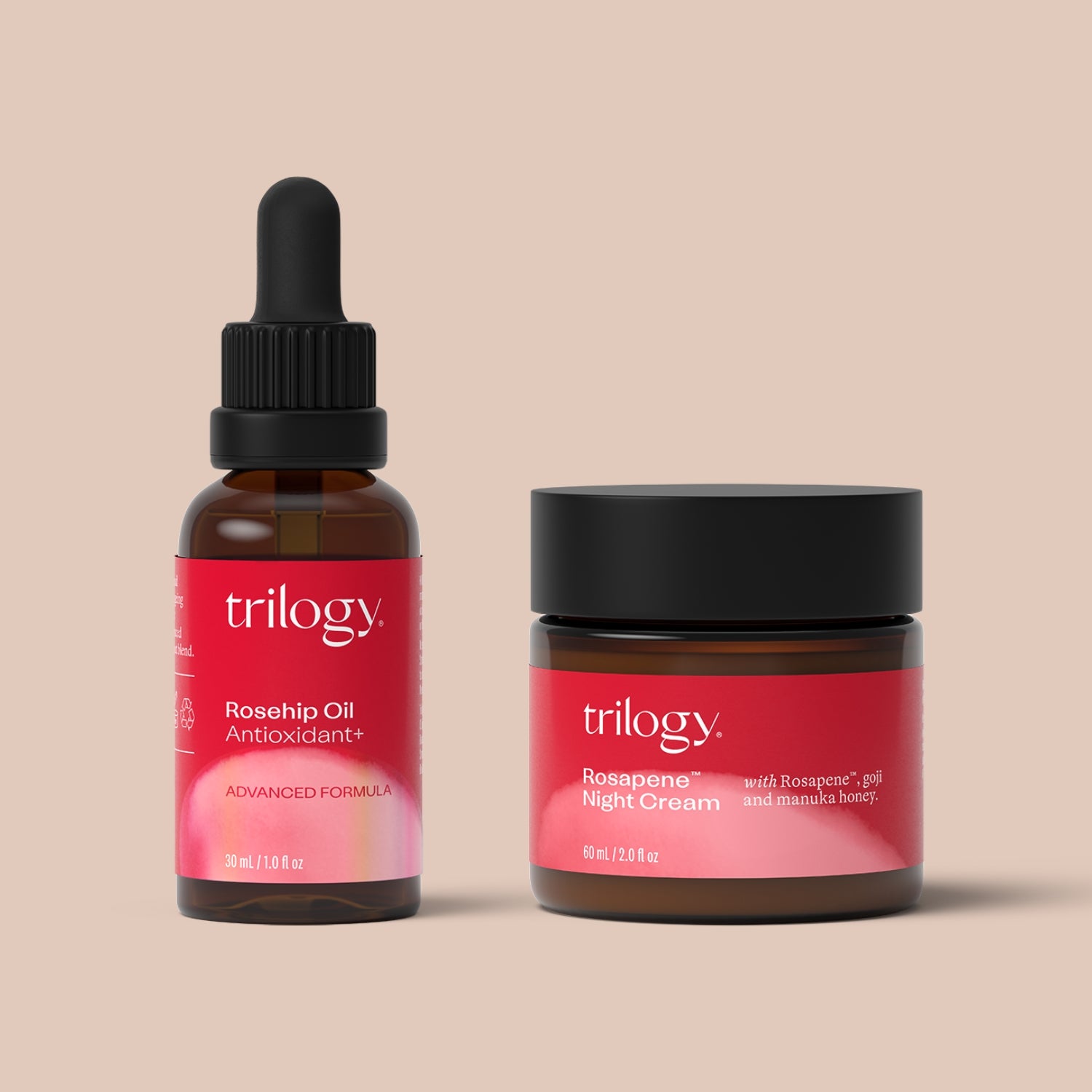 Dieses Duo aus Rosehip Oil Antioxidant+ und Rosapene™ Night Cream bietet eine gezielte Pflege, die die Hautbarriere stärkt, Feuchtigkeit bewahrt und die Haut widerstandsfähig gegen äußere Einflüsse macht – für eine sichtbar gesunde und geschützte Haut.